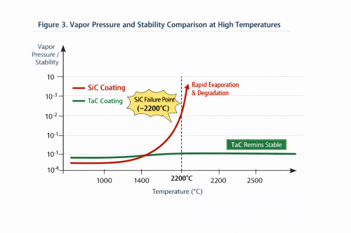 Термодинамичка стабилност без премца: Тантал карбид (ТаЦ) има запањујућу тачку топљења од 3880°Ц. Према истраживању у часопису Јоурнал оф Цристал Гровтх, СиЦ премази пролазе кроз „неконгруентно испаравање“ изнад 2200°Ц—где силицијум сублимира брже од угљеника, што доводи до деградације структуре и контаминације честицама. Насупрот томе, притисак паре ТаЦ је 3 до 4редова величине ниже од СиЦ, одржавајући нетакнуто топлотно поље за раст кристала.
